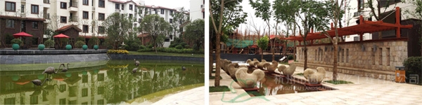 在紫荊東郡小區,水景隨處可見,從主入口兩側近50米的景觀橋水景,到入口正前方一個大型的石雕噴泉,再到小區里面幾條主干道交匯的十字路口的小型地面噴泉,中心水景上的圓形石雕噴泉,特別是不遠處的動物噴泉雕塑,只只鶴低頭凝思,細長的水流從鼻端的出水口處流出,落入下方的水池里,更是格外引人注目。“這些水景小品具有的藝術特性與審美效果,加強了整個景觀環境的藝術氛圍,成為讓空間環境生動起來的關鍵因素,在提高小區藝術品質和景觀形象的同時,更給人們帶來美的享受。”楊經理如是說。