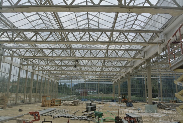 青山湖?花園中心工地正在施工的玻璃溫室大棚