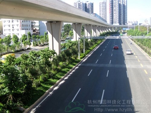 該工程最大的特色和亮點為:“以人為本,尊重自然”、“ 處處有綠葉,無處不飛花”等自然生態(tài)的設(shè)計理念貫穿始終;中央綠化帶位于高架橋下,長勢茂盛的各類植物形成一條繽紛絢麗的彩帶擁簇著高架橋段,使整條橋段與綠化景觀有機(jī)融合。2012年,該工程榮獲中國風(fēng)景園林學(xué)會“優(yōu)秀園林綠化工程金獎”。
