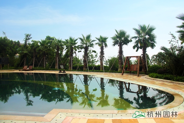 露天泳池區(qū)景觀獨具特色,選用華棕、棕櫚、布迪椰子、加拿利海棗等熱帶植物作為主景,營造出簡約大方、層次分明的濃郁熱帶園林風情。為了提高這些熱帶植物的成活率,降低后期的養(yǎng)護成本,這批植物都經(jīng)過馴化,較能適應吳江的氣候條件。該區(qū)面積較大,從酒店的觀景平臺上往下看,泳池中間的小島就像彎彎的小船,仿佛要順流而下;水質清澈見底,水底大面積的藍色和黃色玻璃馬賽克,營造出波光鱗鱗的效果,偶有微風吹來,水面蕩起陣陣漣漪,流動的線條瞬間充滿了生機和活力,整個泳池仿佛都動了起來。岸邊的植物高大茂密,郁郁蔥蔥,透過樹叢的間隙,浩渺無邊的太湖水系與遠處的天際線連接在一起,恍然之間,好象是來到了充滿陽光、海浪、沙灘的南國熱帶海域,心情的舒暢不言自喻。