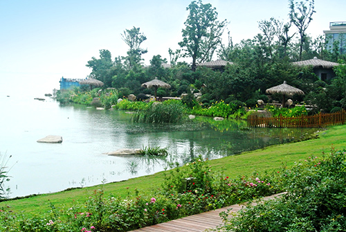吳江東太湖溫泉度假酒店是一個旅游度假項目,位于江蘇省吳江市松陵鎮,坐擁東太湖天然水景資源,視野開闊,景觀宜人。該項目景觀工程施工總面積21.5萬平方米,分兩個標段進行。一標段施工面積13萬平方米,總造價7800萬元,由杭州市園林綠化股份有限公司承建;二標段施工面積8.5萬平方米,總造價2800萬元,由杭州蕭山園林集團有限公司承建。工程施工包括:綠化種植、土建施工、景觀小品、水景、景觀建筑、給排水系統及景觀照明系統等。該項目五大景觀亮點為工程添光加彩,獲得了2014年度“中國風景園林學會優秀園林工程大金獎”。