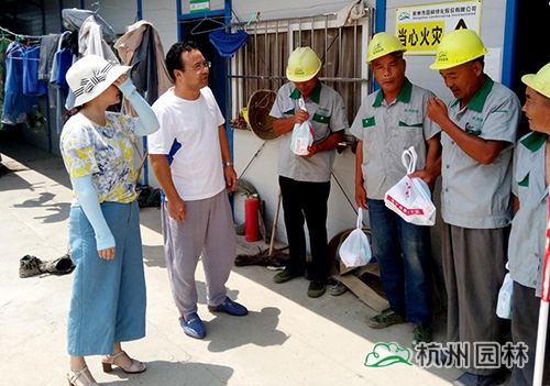7月20日,工程總監(jiān)胡建深和工會(huì)女工委員鐘晴來到了安慶市2017城區(qū)綠化提升工程施工管養(yǎng)一體化工程現(xiàn)場,先后為6號(hào)游園、集賢路等項(xiàng)目做綠化養(yǎng)護(hù)的工人們送上了防暑降溫用品,并感謝他們的辛勤付出,囑咐大家一定要做好防暑措施。