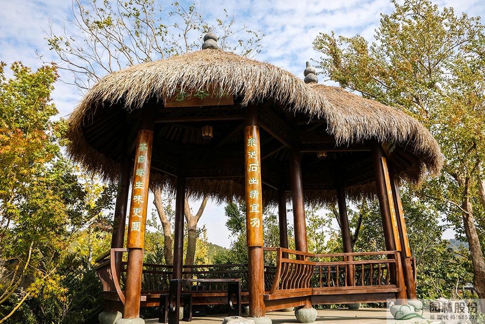 走出湖畔居,沿著山石小道拾級而上,來到“問茶”展區。伴著翠綠的茶葉和淡淡的茶香,登上杭州園的制高點——茅草雙亭。茅草雙亭有兩塊匾額,一塊是“問茶”,一塊是“聽泉”?!皢柌柰ぁ闭胺降膸字瓴铇涫遣鑸@的點睛之筆,設計靈感取自“西湖龍井十八棵御茶”。在亭子邊還有一處泉眼——“滌心”,“滌心”是乾隆皇帝御題的“龍井八景”之一,寓意溪水清澈,心靈清凈。